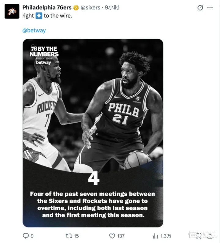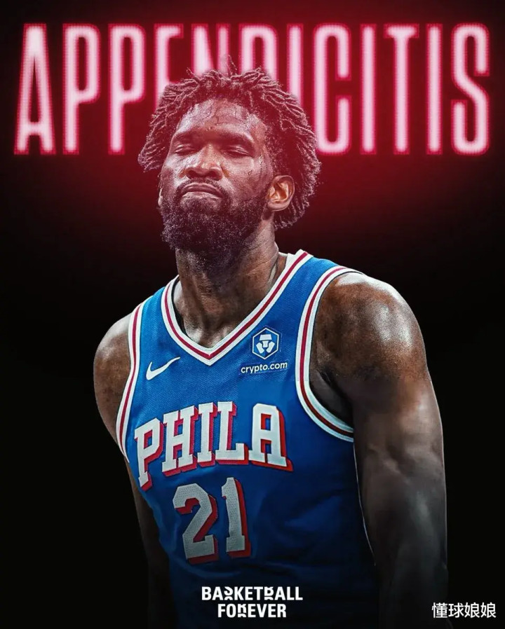 9小时前,76东谈主官方账号还用恩比德四肢海报封面在盘货曩昔和火箭的几场交手。推文发完的3个小时,76东谈主就官方晓谕恩比德要在休斯顿作念手术。看来应该是急性阑尾炎,落地休斯顿之后才发病的。