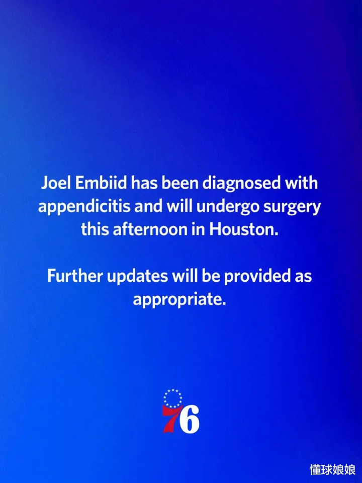 恩比德也有随队到了休斯顿,然后在休斯顿进病院了。76东谈主官方晓谕,球队中锋乔尔-恩比德近日已在休斯顿进行了阑尾切除手术。