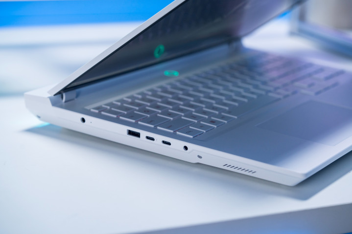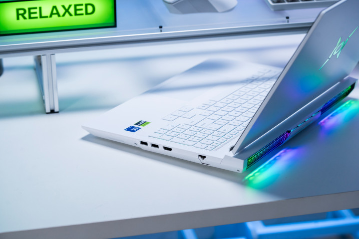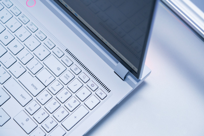 我手上这台是白色,游戏本A面是猎东谈主logo,B面16英寸雾面屏,何况是对眼睛更友好的高修养LCD屏幕,C面则是全尺寸键盘,并带突出字小键盘,同期撑抓ARGB 多分区背光。