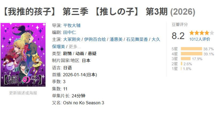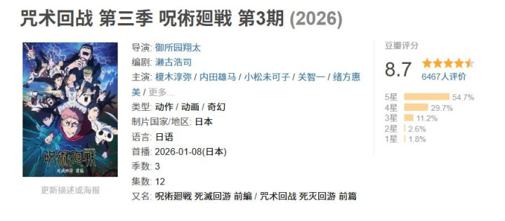 咱们作念个对比:【《我推的孩子3》,8.2分,1012评价,剧评3篇】;【《甘休的芙莉莲2》9.2分,5225评价,剧评11篇;【《咒术回战3》8.7分,6467评价,剧评16篇】。咱们可以发现一个问题:《我推的孩子3》、《咒术回战3》以及《甘休的芙莉莲2》齐有固定的粉丝当然评价高。这个就能看出有原粉丝托底后动画质料、粉丝评价以及献艺成果齐有高的情理。