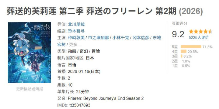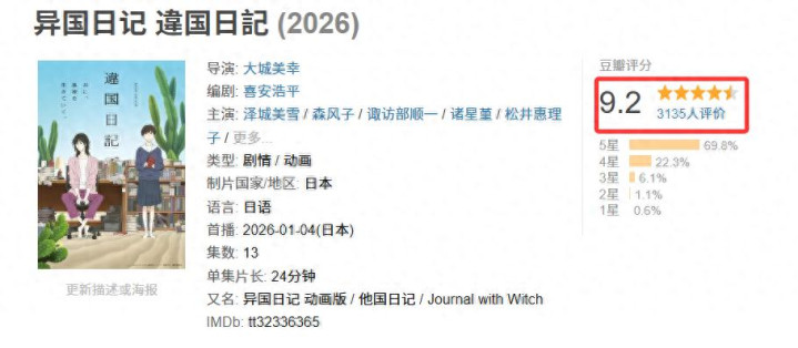 回到《别国日志》自己来看,当今的1月新番大部分齐依然快到扫尾了,那么有若干读者赐与了好评和评价呢?是的,基本莫得若干。就拿豆瓣来说,【9.2分,3135东说念主评价,剧评33篇】这个数目来说依然是1月新番中TOP级别的存在了。